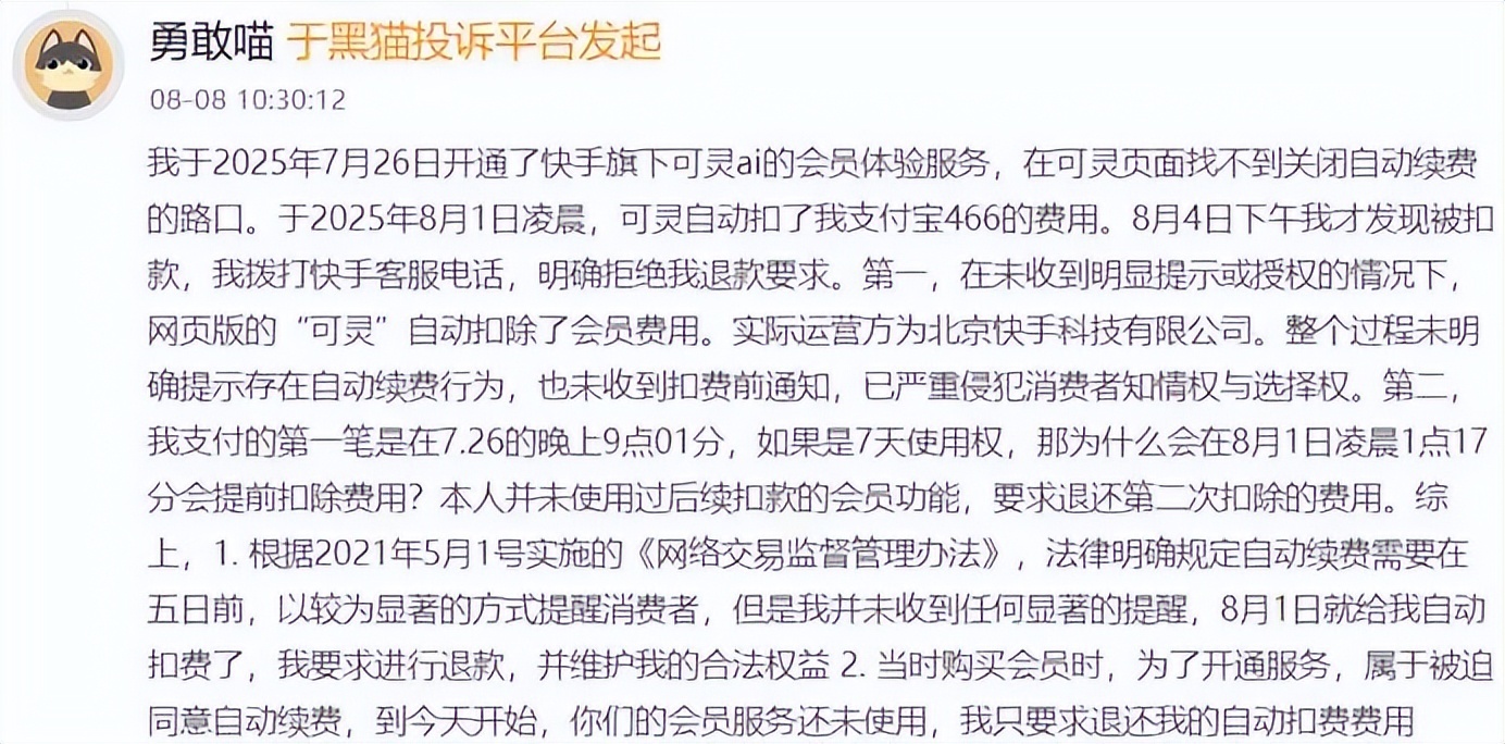 据程一笑此前介绍,可灵AI营业收入主要由P端付费用户(指专业的自媒体、视频创作者和广告营销从业者等)以及为企业客户提供API服务构成,而其中近70%由P端付费用户贡献。但是,有不少用户不满可灵AI的扣费问题。在“黑猫投诉”平台上,有超过1100条包含“可灵AI”搜索词的投诉。