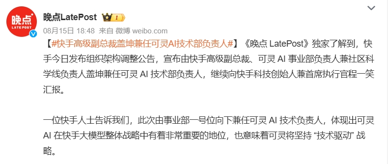 近期,负责大模型与可灵技术方向的副总裁张迪确认离职,由盖坤全面接手。这一交接意味着可灵从原先的“技术主导”,过渡到由更靠近社区运营和平台架构的管理者统筹,或将影响未来的产品迭代节奏与技术深度。